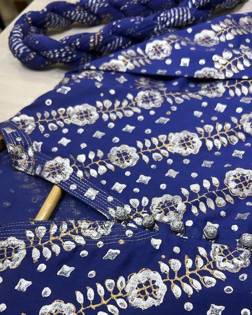 A stunning representation of the art of fashion in this indigo blue with Copper and Silver Block Print. - Stitched Collection