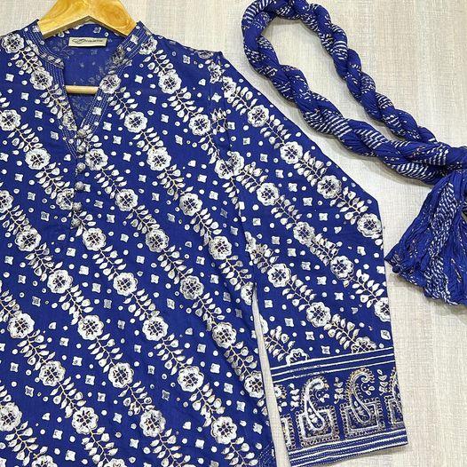 Elevate your style with this stunning indigo blue block print outfit. The intricate copper and silver detailing adds a touch of elegance to your ensemble. Showcasing the art of fashion, this stitched collection is a must-have for any wardrobe.