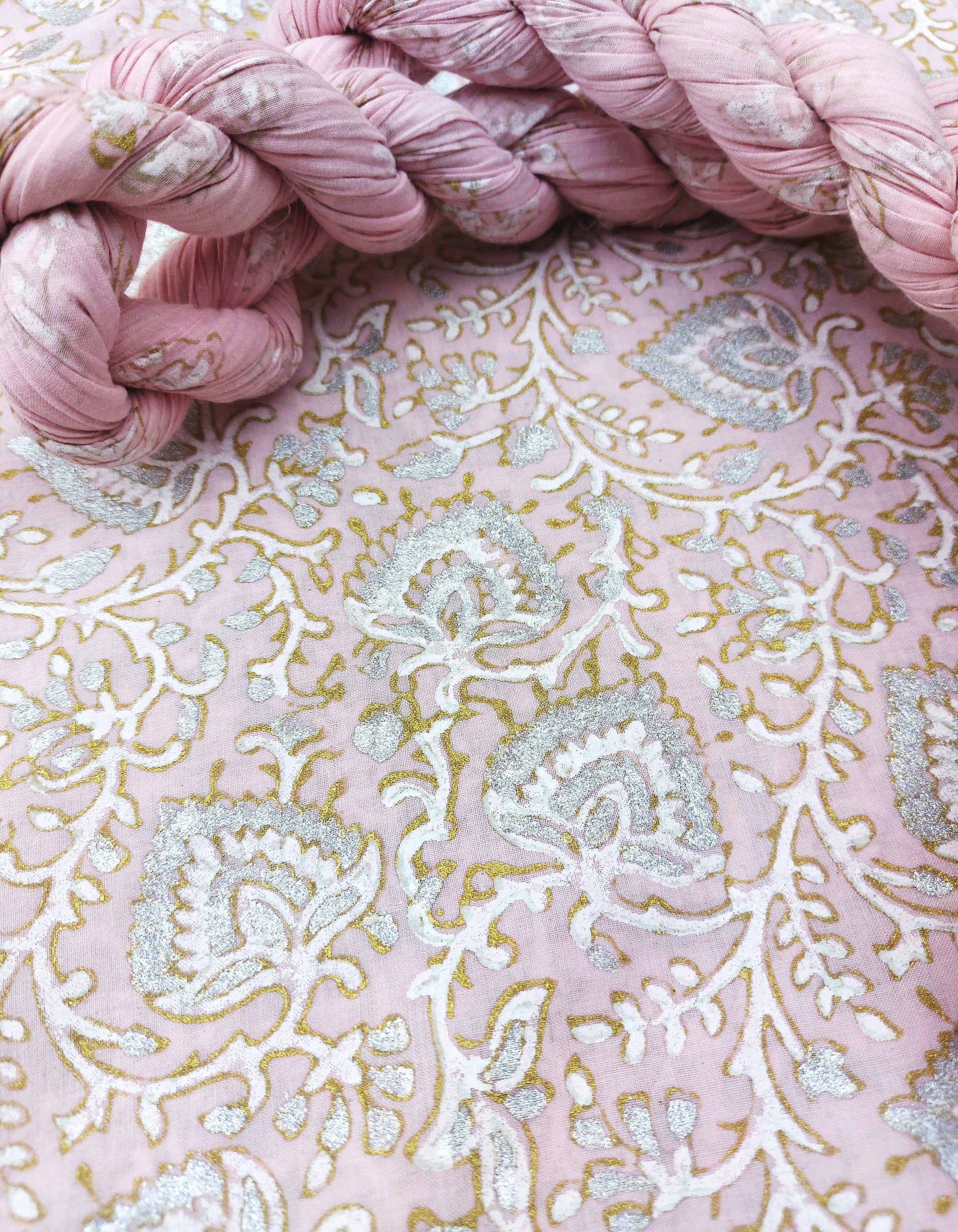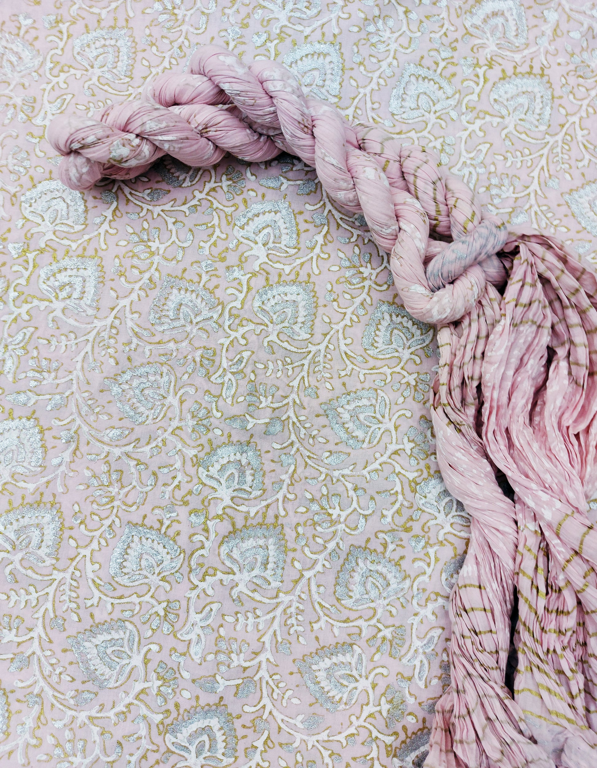 Are you searching for a gorgeous addition to your wardrobe? Consider the floral Block Printed fabric with luxurious Gold Silver and White. Its pure lawn material and crushed dupatta in Light Pink make it a stylish and effortless option. Plus, the hand block printing adds a one-of-a-kind element to this unstitched shirt. Don't pass up this essential item!