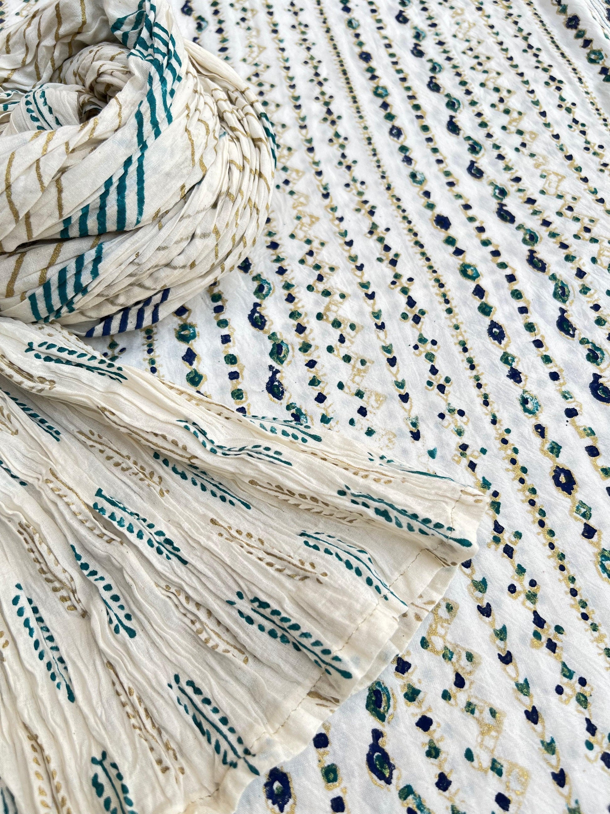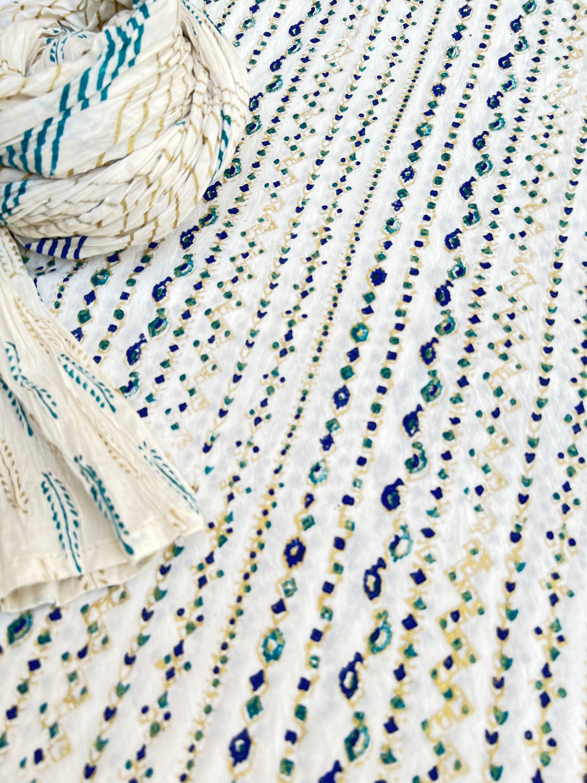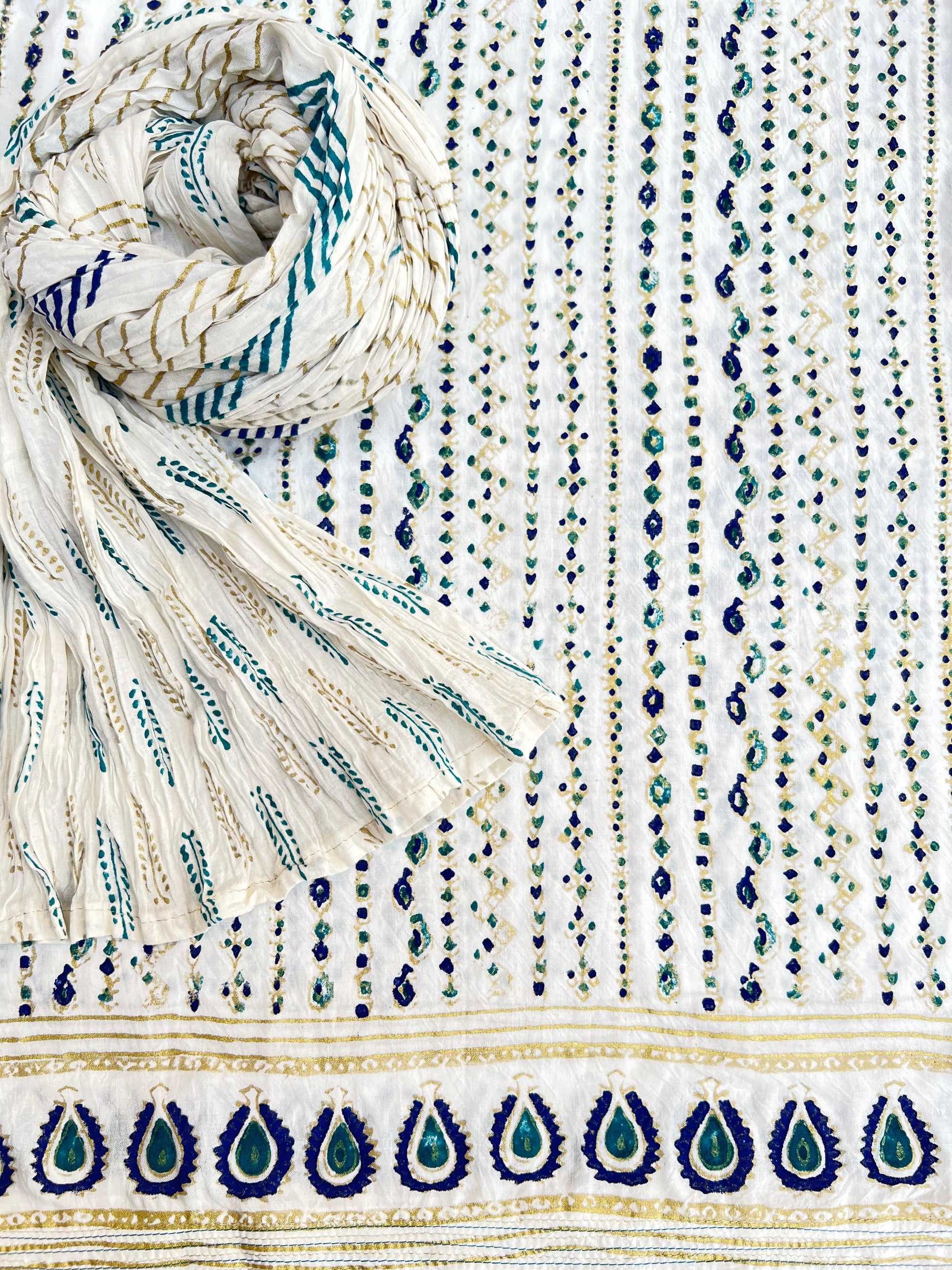 Introducing our stunning Gold Ferozi and blue block printed Matrix design on kora white fabric. Elevate your style with this unique and handcrafted piece, perfect for any occasion. The intricate block print adds a touch of elegance while the contrasting colors make a bold statement. Expertly crafted, this piece is a must-have for any fashion-forward individual.