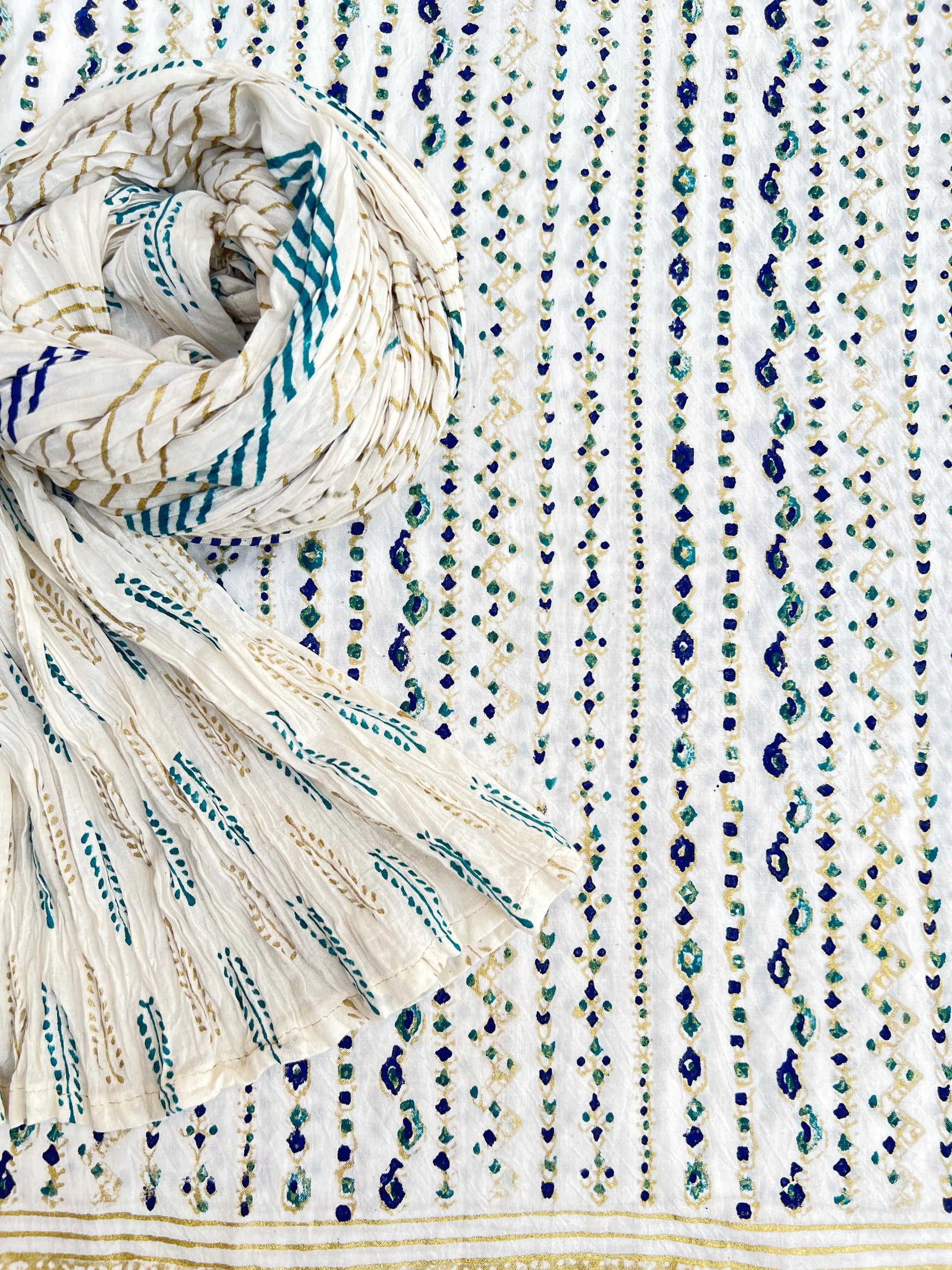 Gold Ferozi and blue block printed Matrix design on kora white fabric