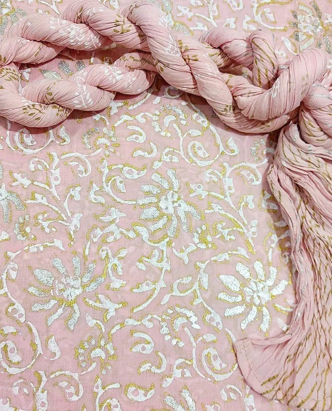 Looking for a stunning addition to your wardrobe? This Alluring Sunflowers Block Printed fabric in luxurious Gold Silver and White might just be what you need! With its pure lawn fabric and crushed dupatta in Light Pink, it's the perfect choice for creating an effortlessly chic look. Plus, the hand block printing adds a unique touch to this unstitched shirt. Don't miss out on this must-have piece!