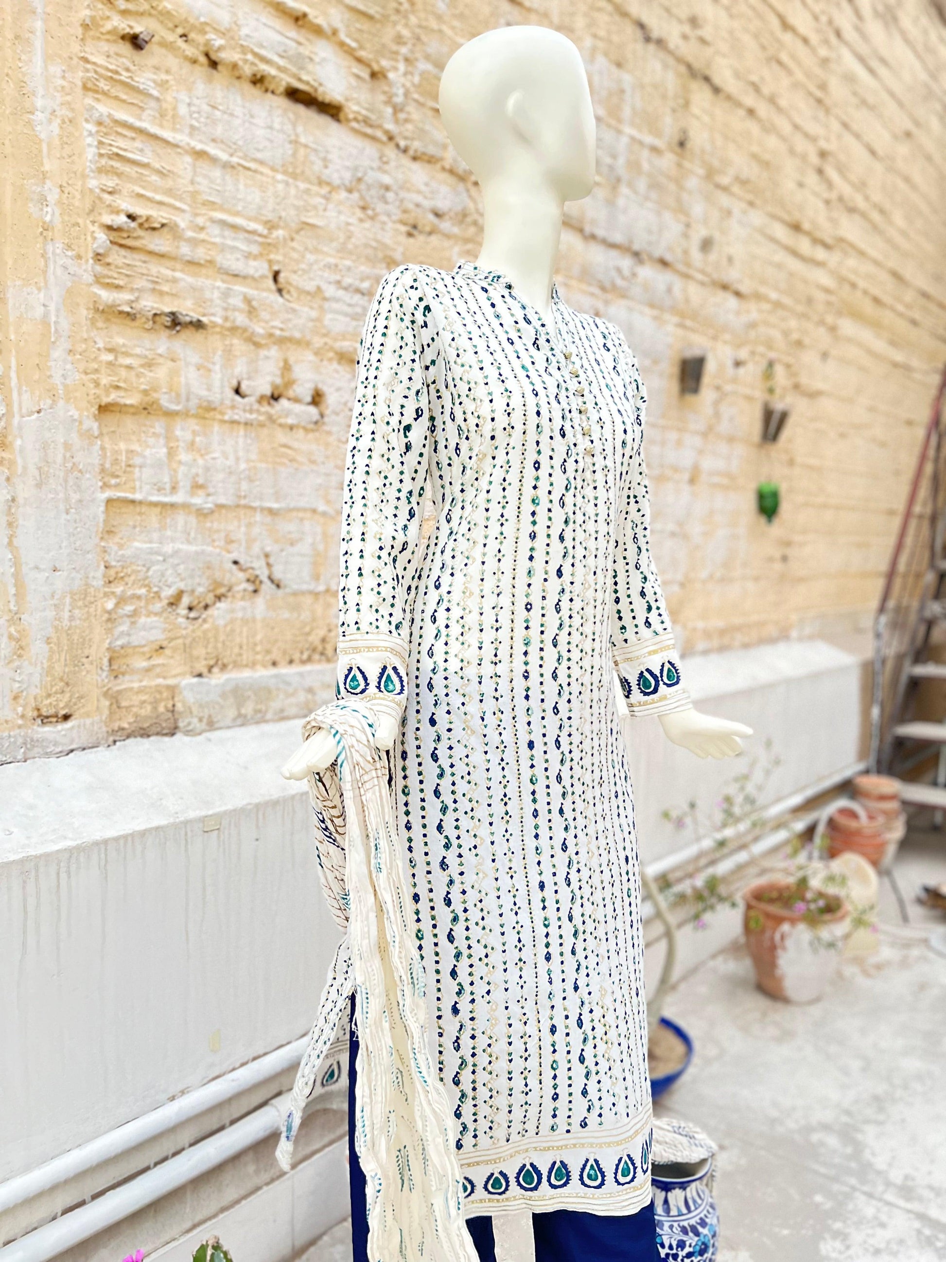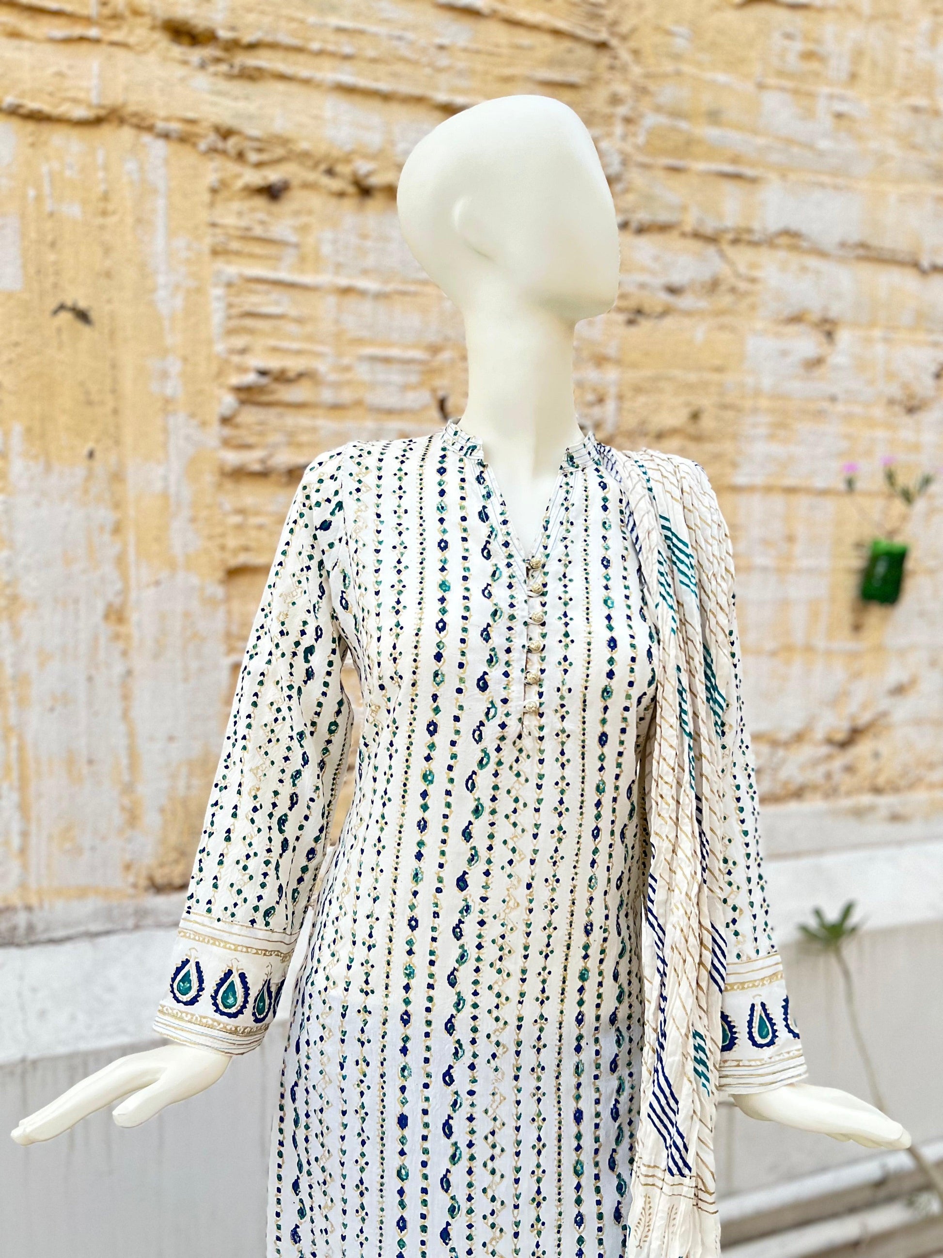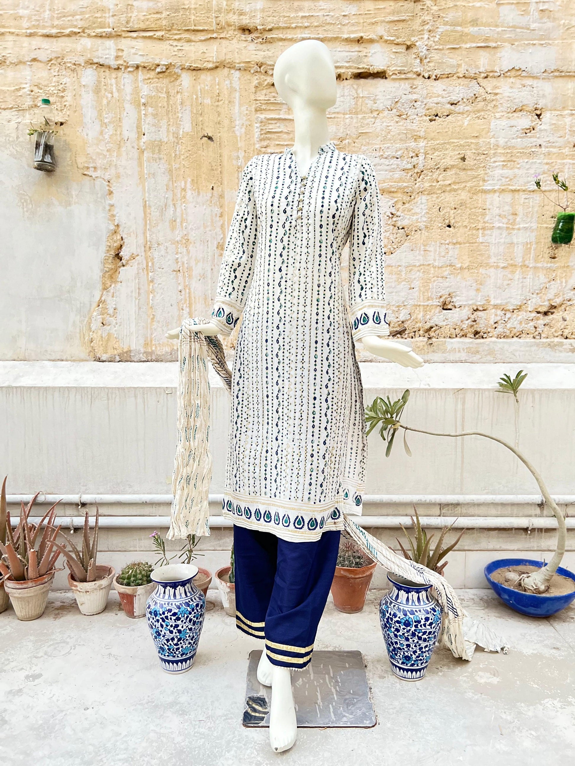 Shine bright in our stunning Gold Ferozi and blue block printed Kora white Pret shirt! Paired with a crushed dupatta featuring a sleek Matrix design, this outfit is a true showstopper!