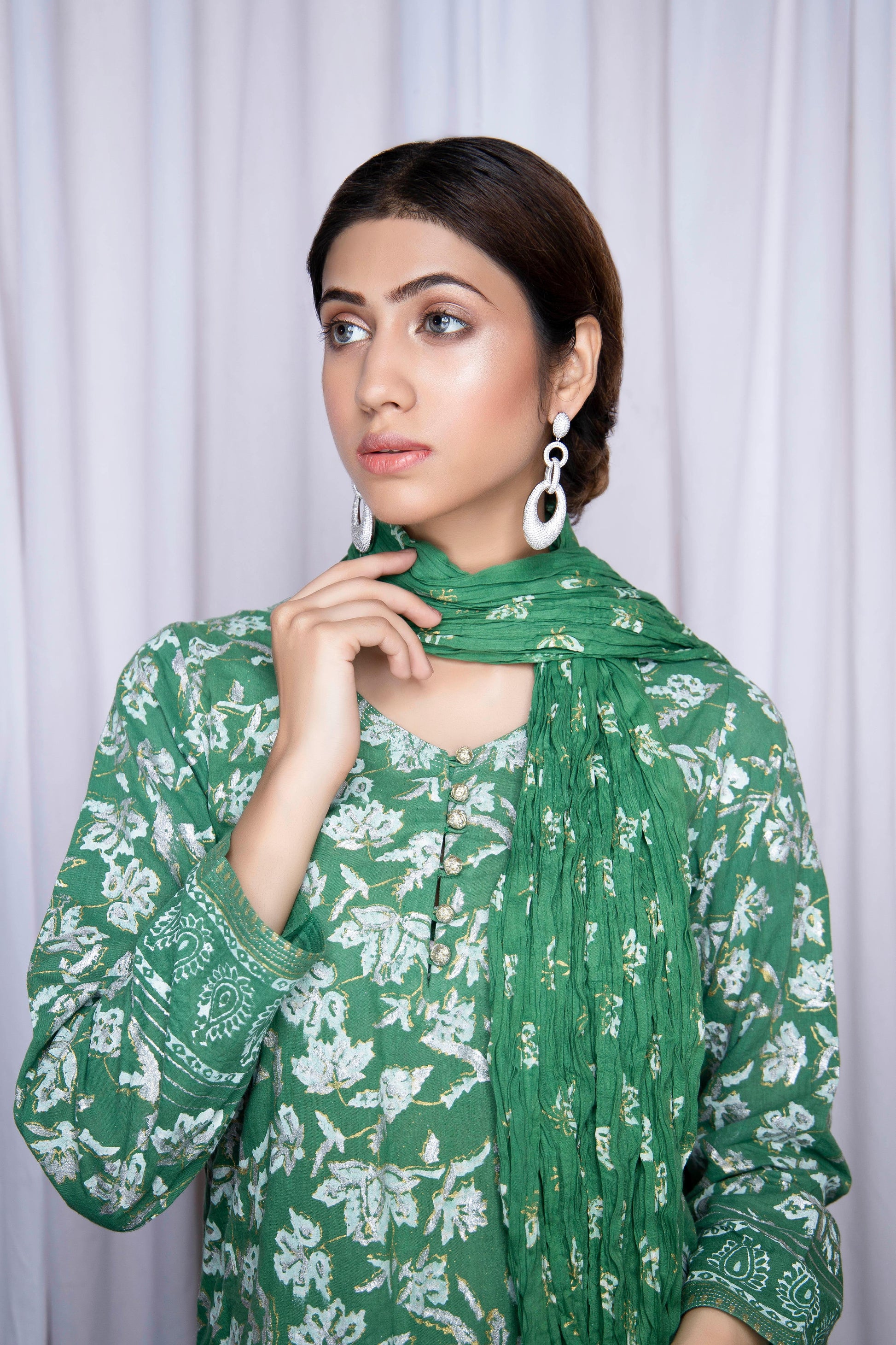 Make you own statement in this gold silver block printed on pretty green - Stitched Collection