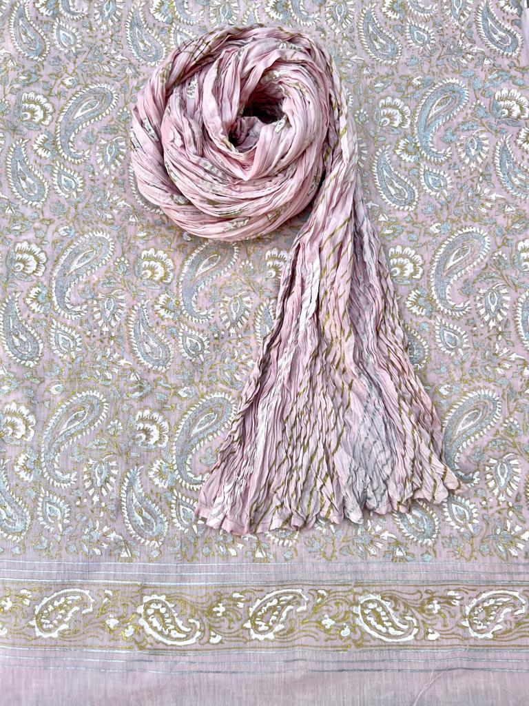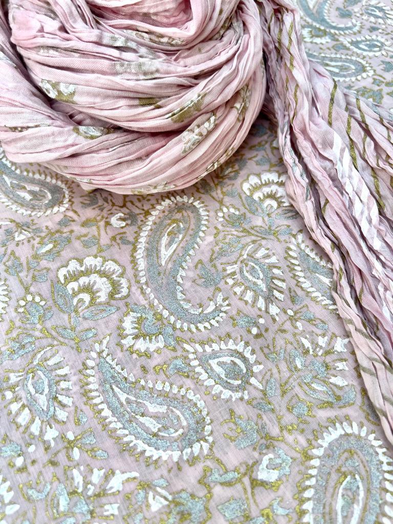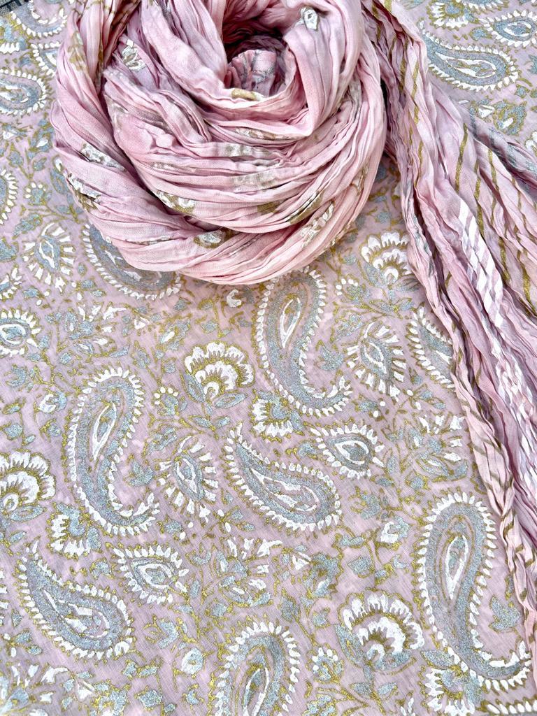 Maryam Paisley Design Hand Block Printed with Gold silver on Light Pink- Unstitched Collection