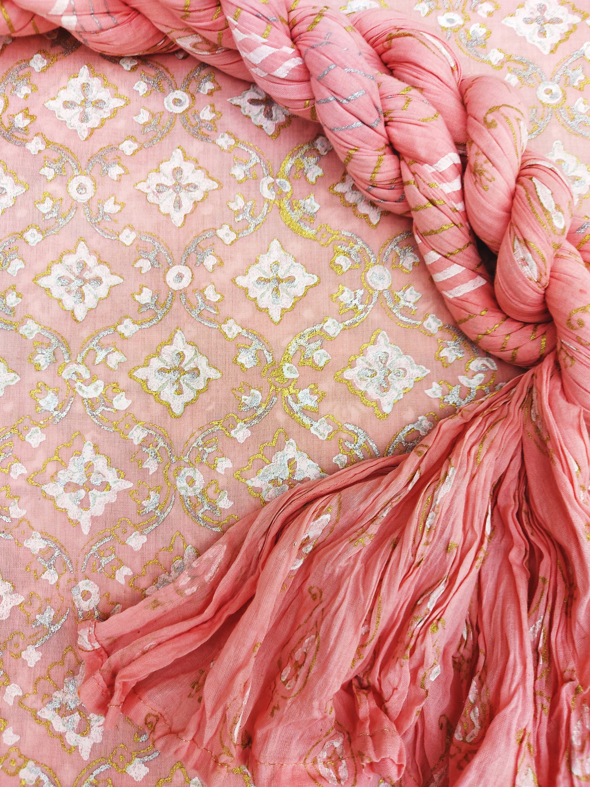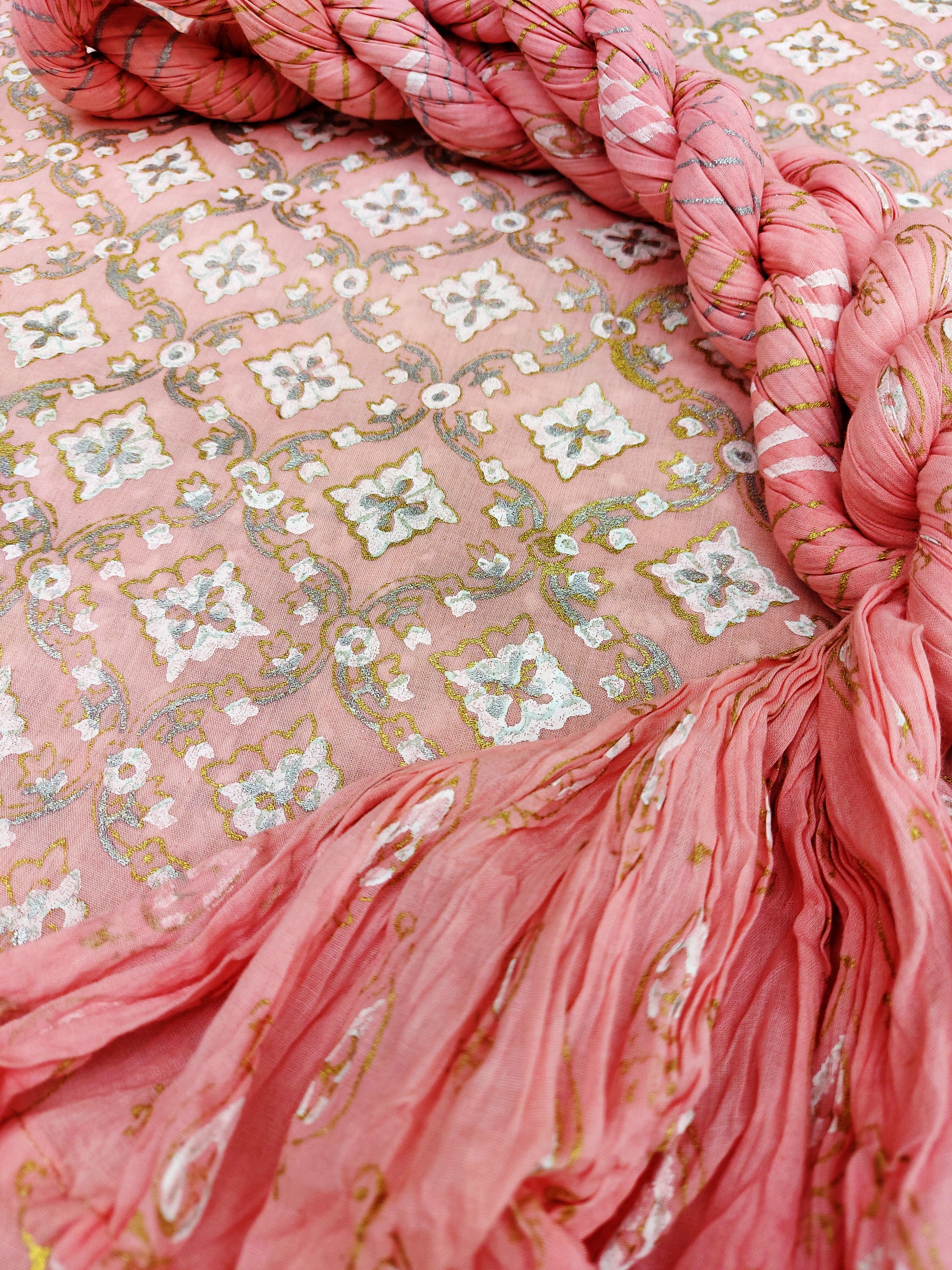 Impress with our chic Floral print fabric - Peach lawn with gold, silver, and white print. Comes with a crushed dupatta. Perfect for any occasion.