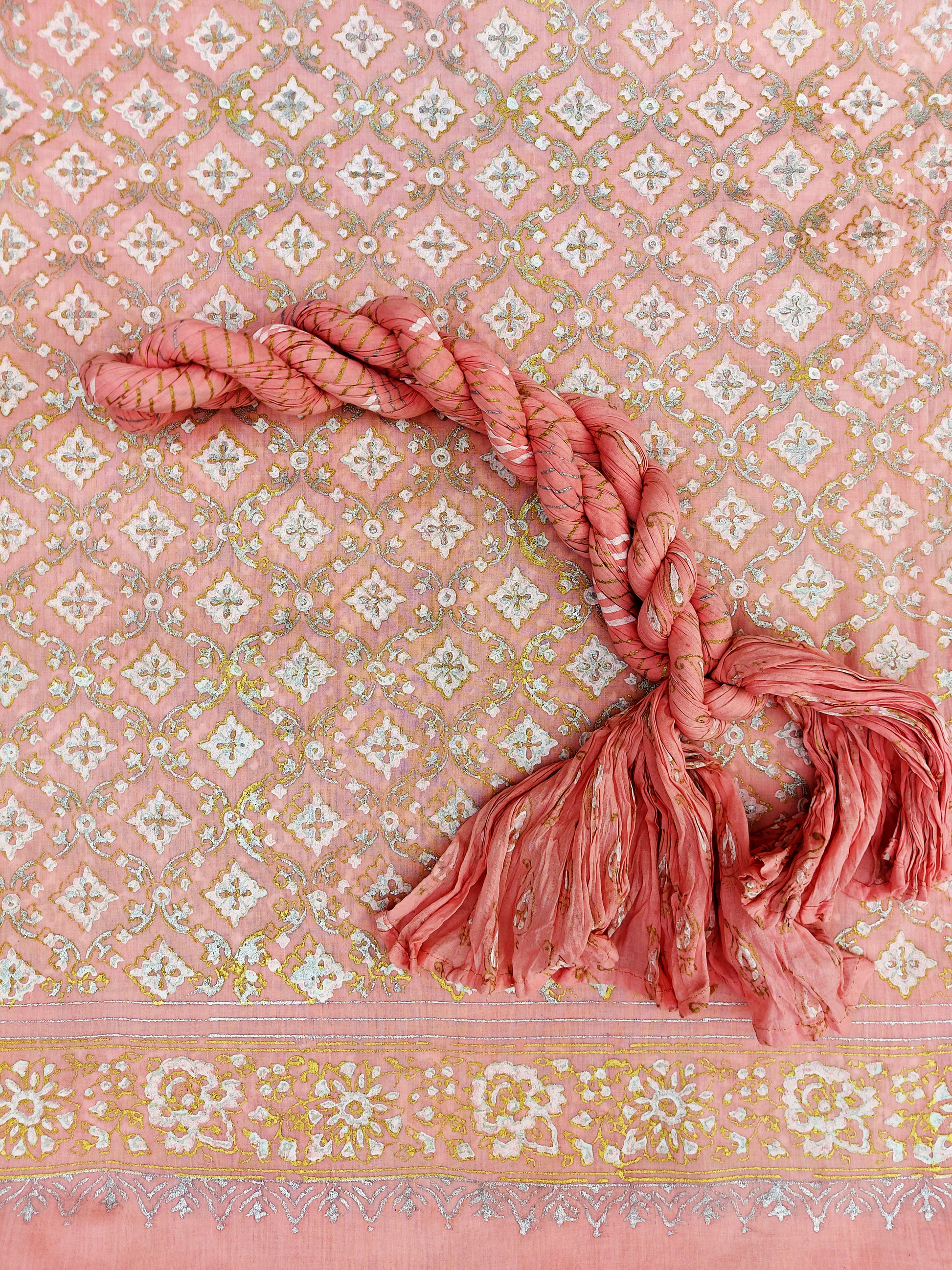 Perfect for any occasion, Peach lawn with gold, silver, and white print. Comes with a crushed dupatta - Unstitched Collection