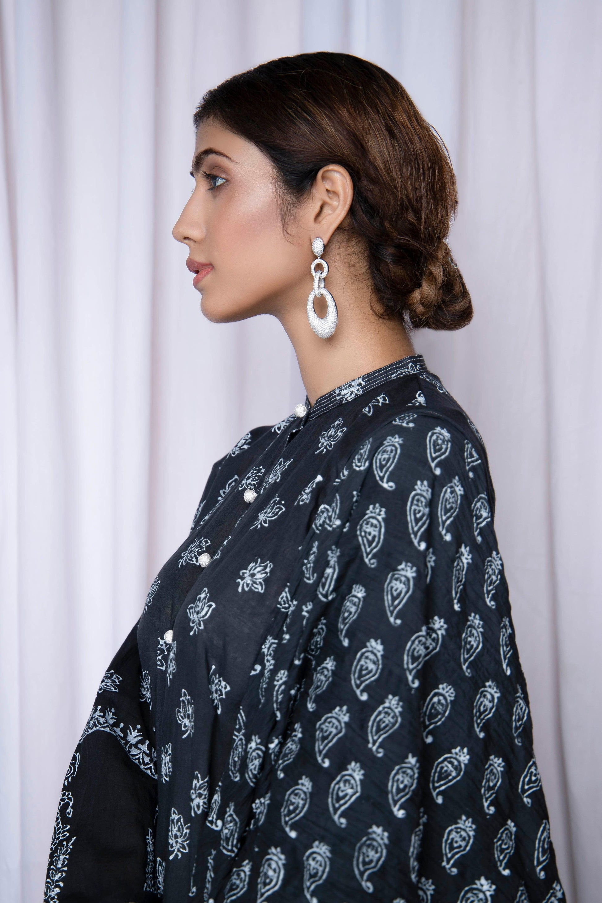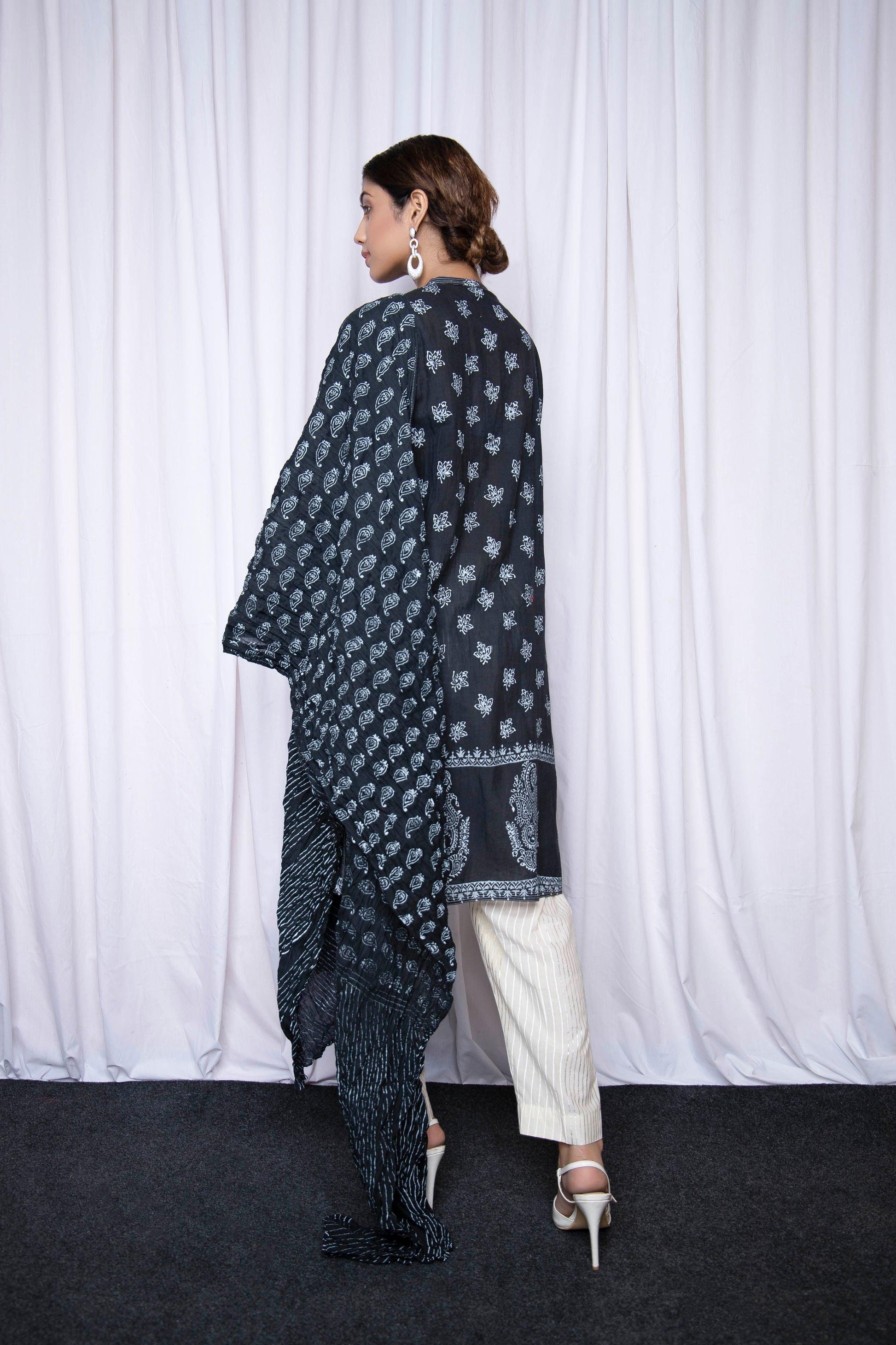 Examine this Small Floral Motif on Jade Black, crafted from high-quality, pure lawn fabric using the block printing technique.
