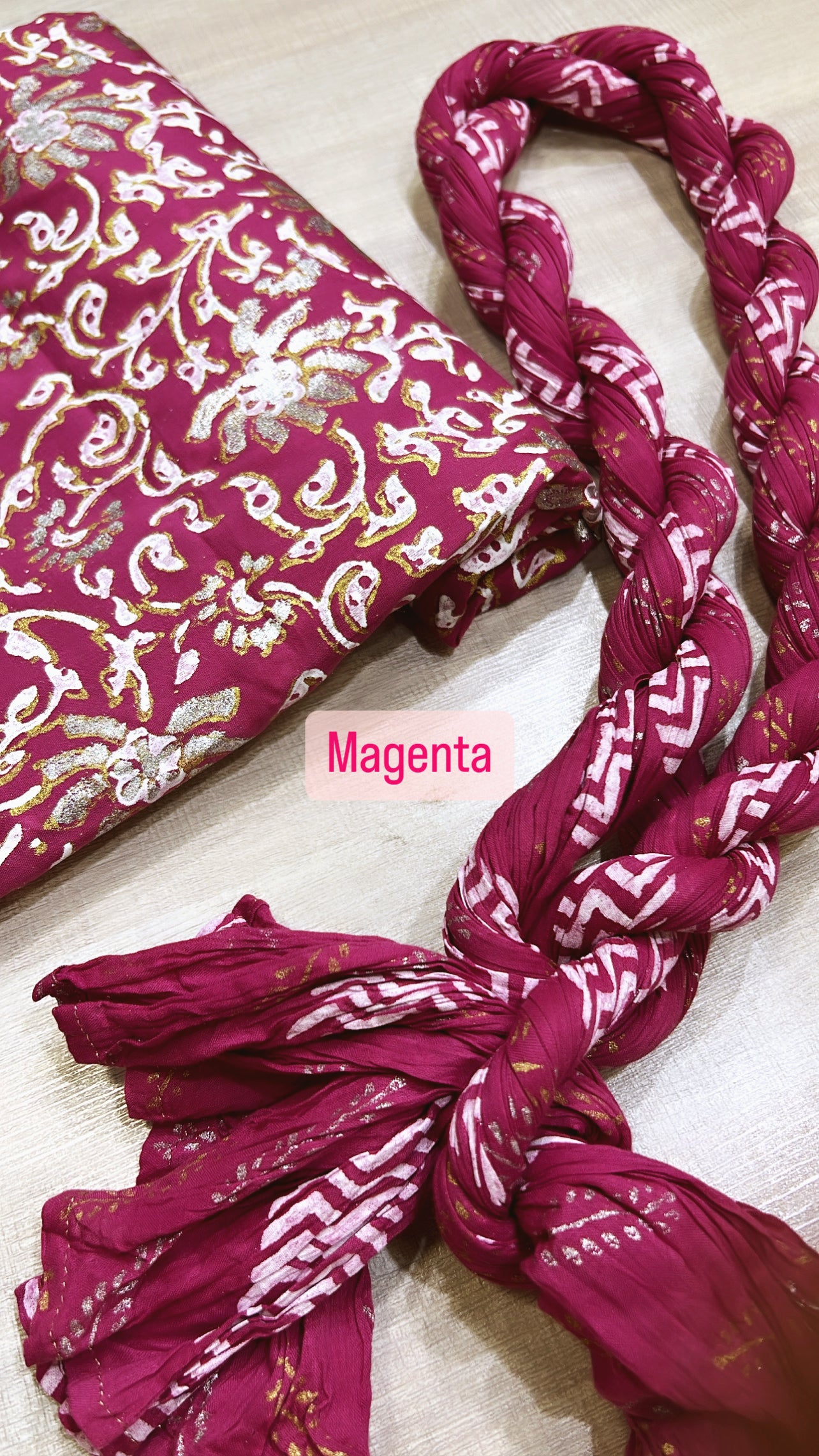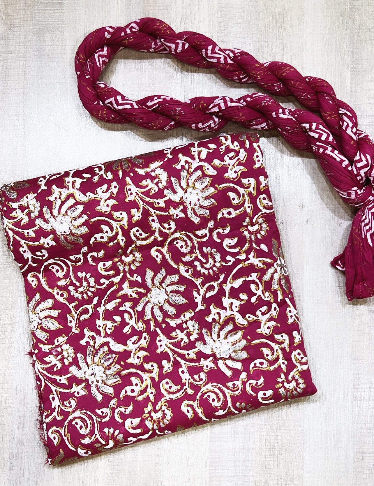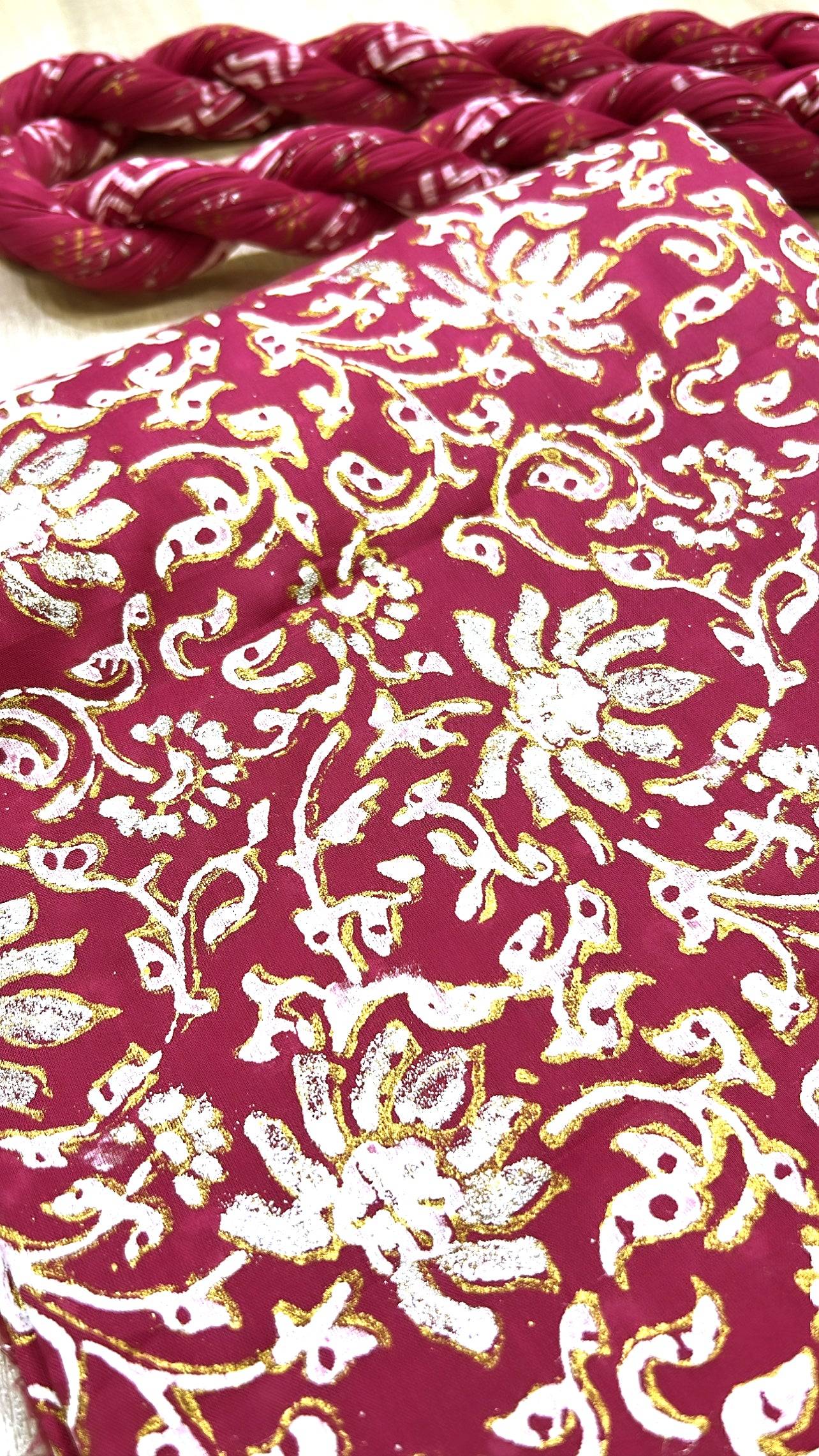 Empower your design expression with our versatile elegant Floral design fabric. The magenta lawn fabric is block-printed with luxurious gold, silver, and white, complemented by a crushed dupatta. Perfect for any occasion, from desi to angrezi.
