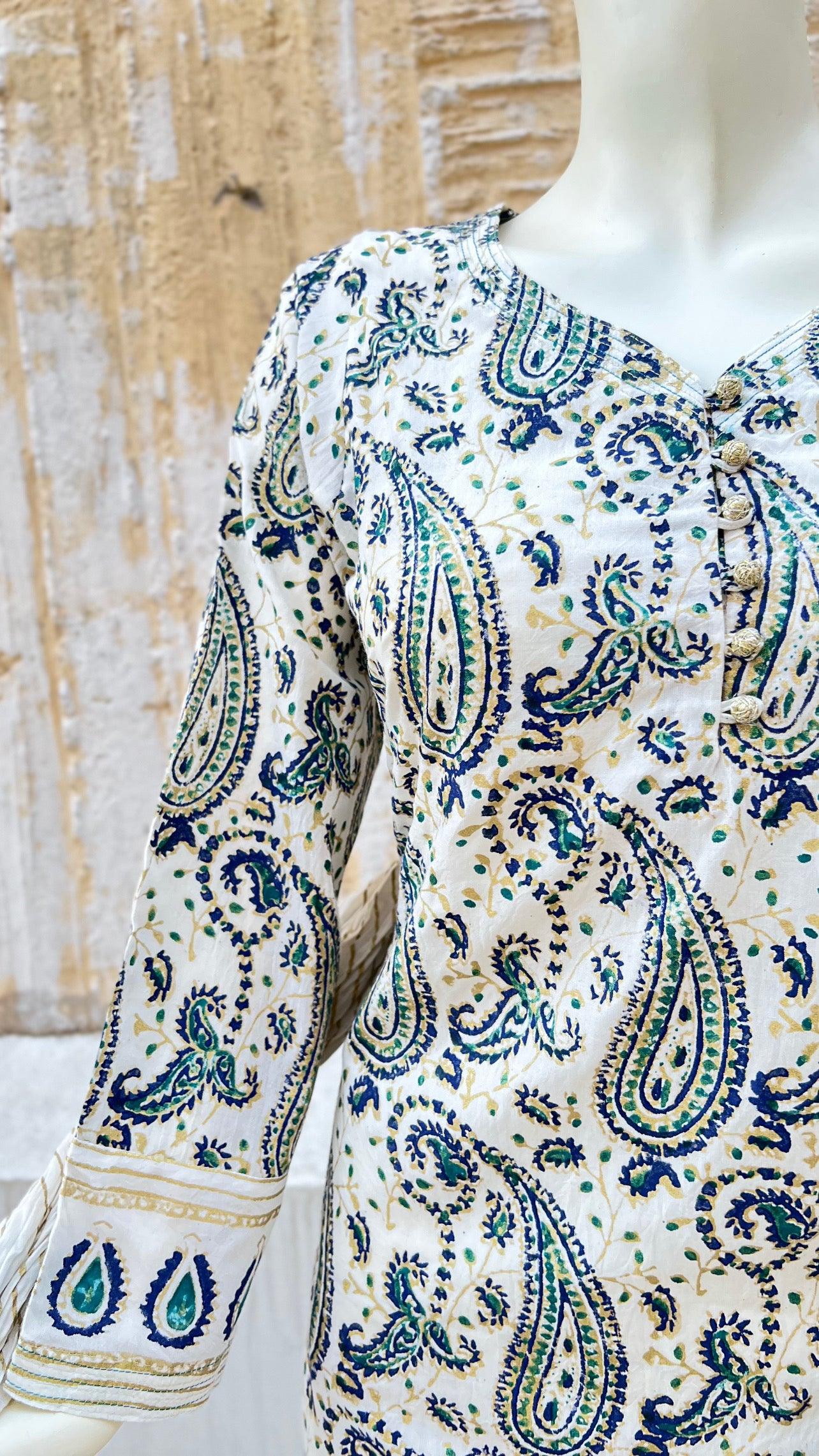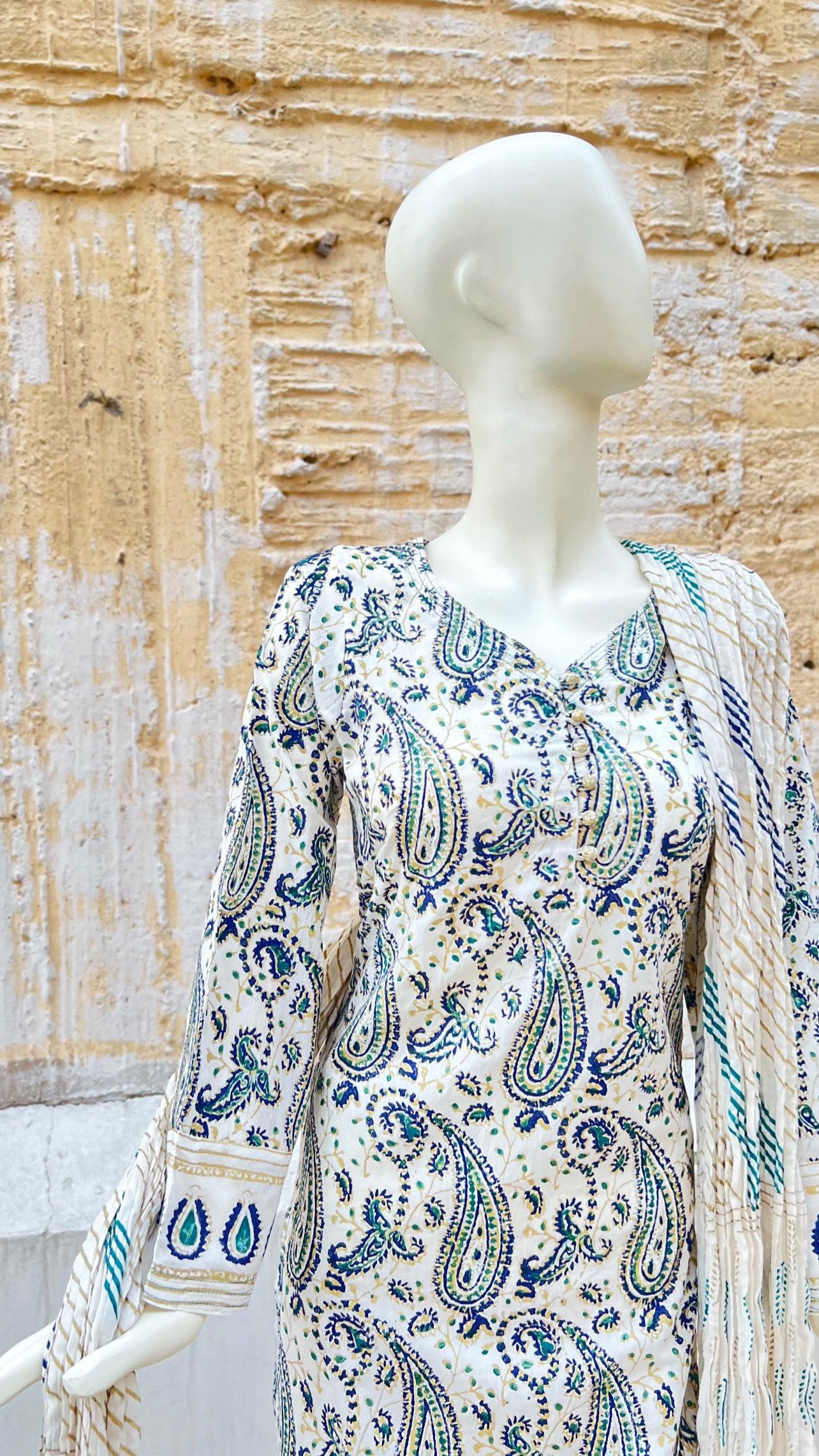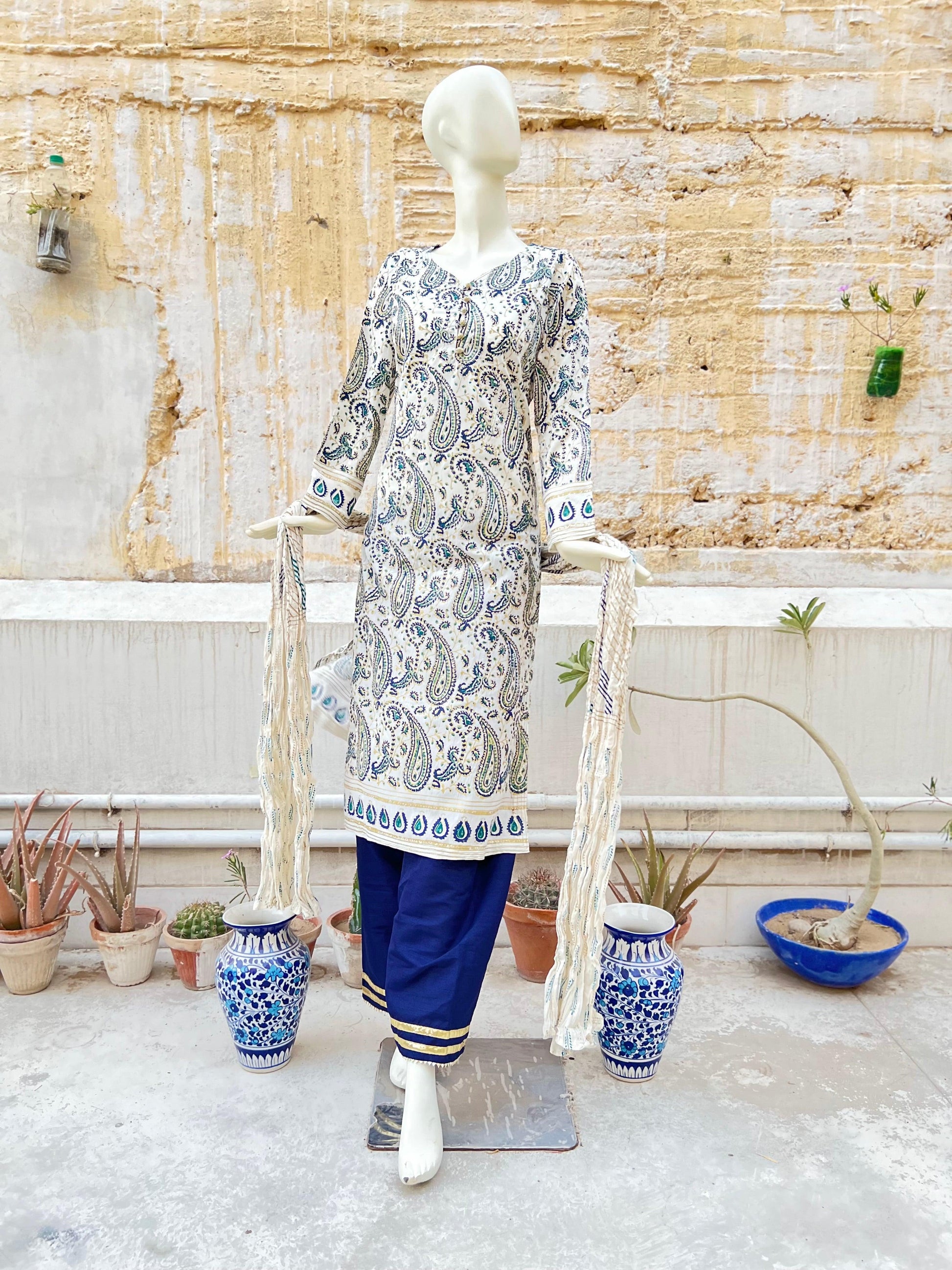 Featuring a sophisticated gold and blue paisley design, this kora white pret shirt comes with a crushed dupatta for added flair. Elevate your look with this elegant addition to your wardrobe, perfect for any occasion.