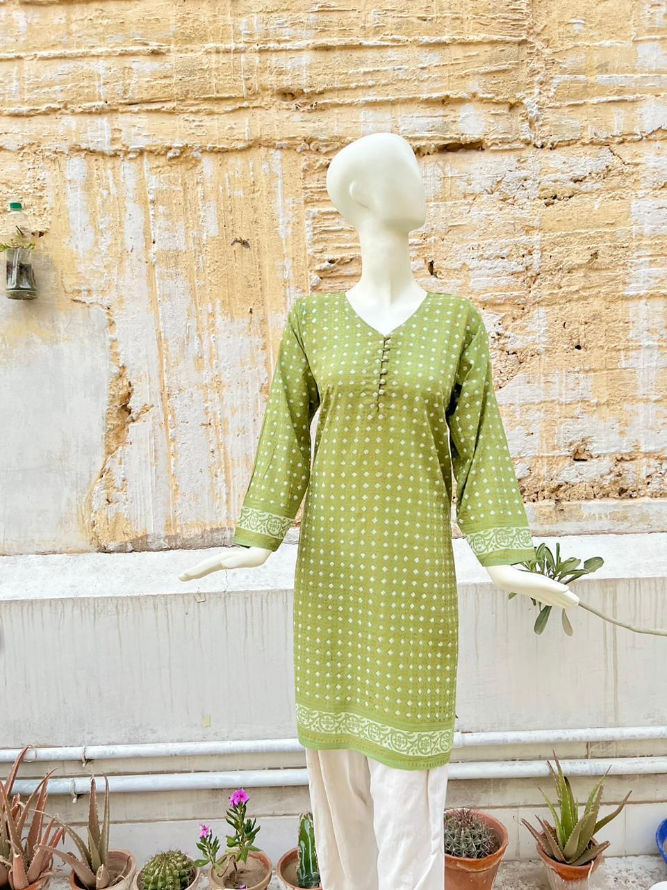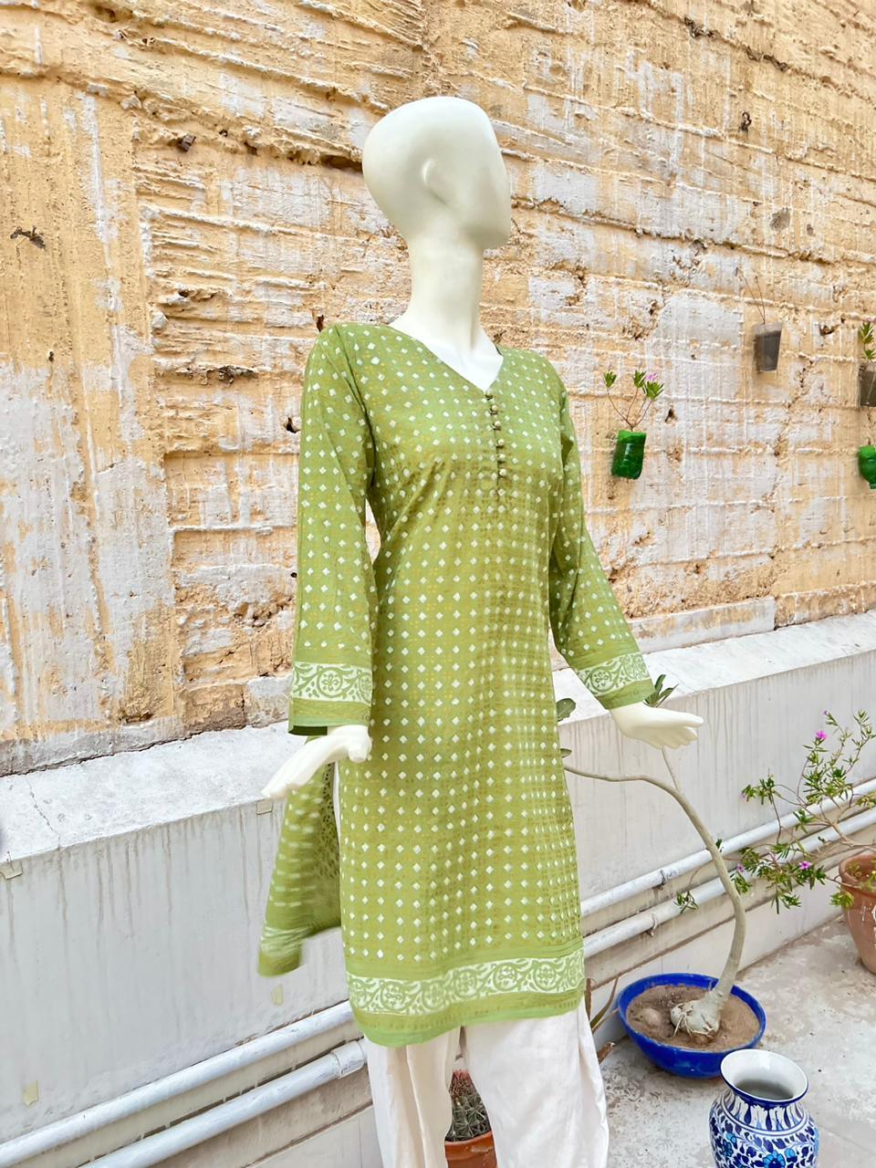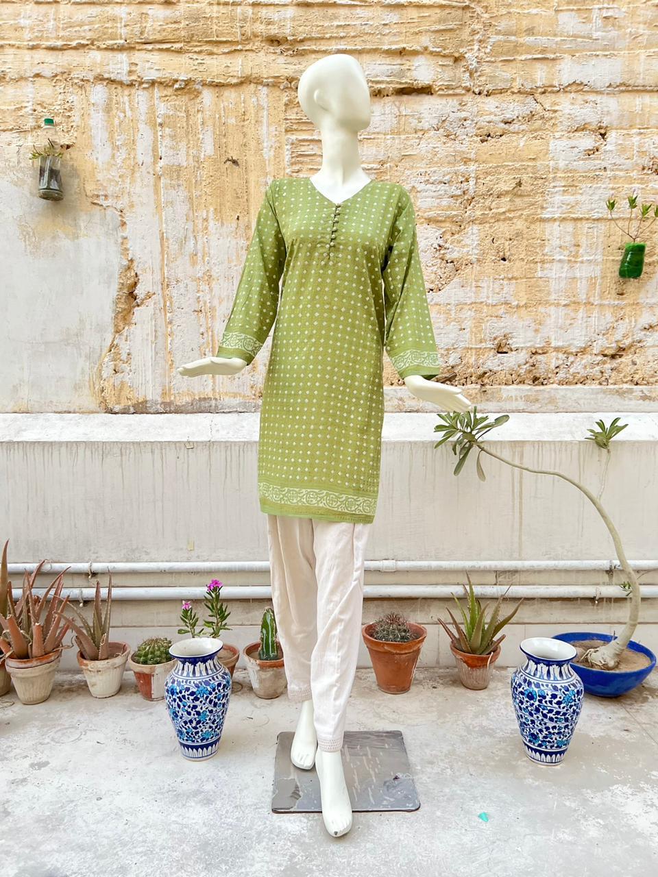 This gold and white block printed pret shirt features a unique geometrical chess print in a natural green color. Perfect for the fashion-forward individual, this shirt adds a touch of sophistication and creativity to any outfit. Made with high-quality materials, this shirt is both stylish and durable.