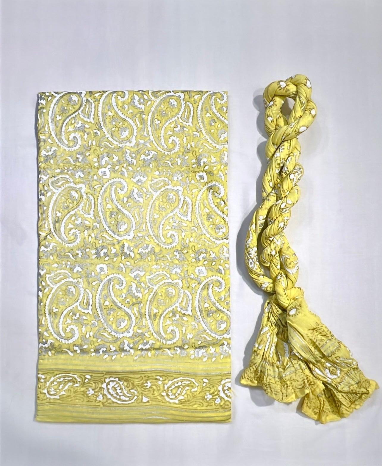 Look Pretty in classic yellow in aesthetic paisley design block printed with Luxury Gold Silver - Unstitched Collection