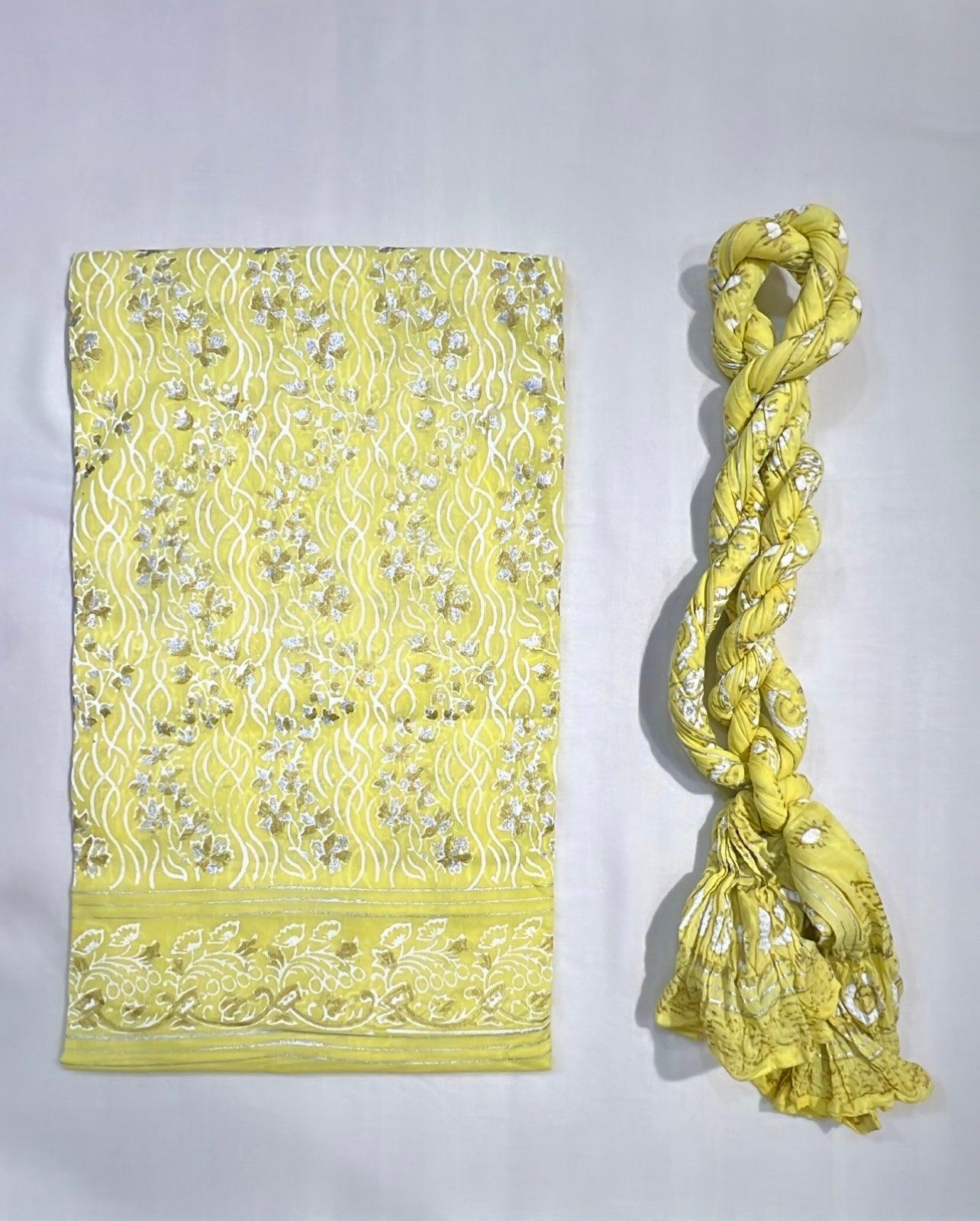 Intricate lilies block printed on lovely yellow - Unstitched collection
