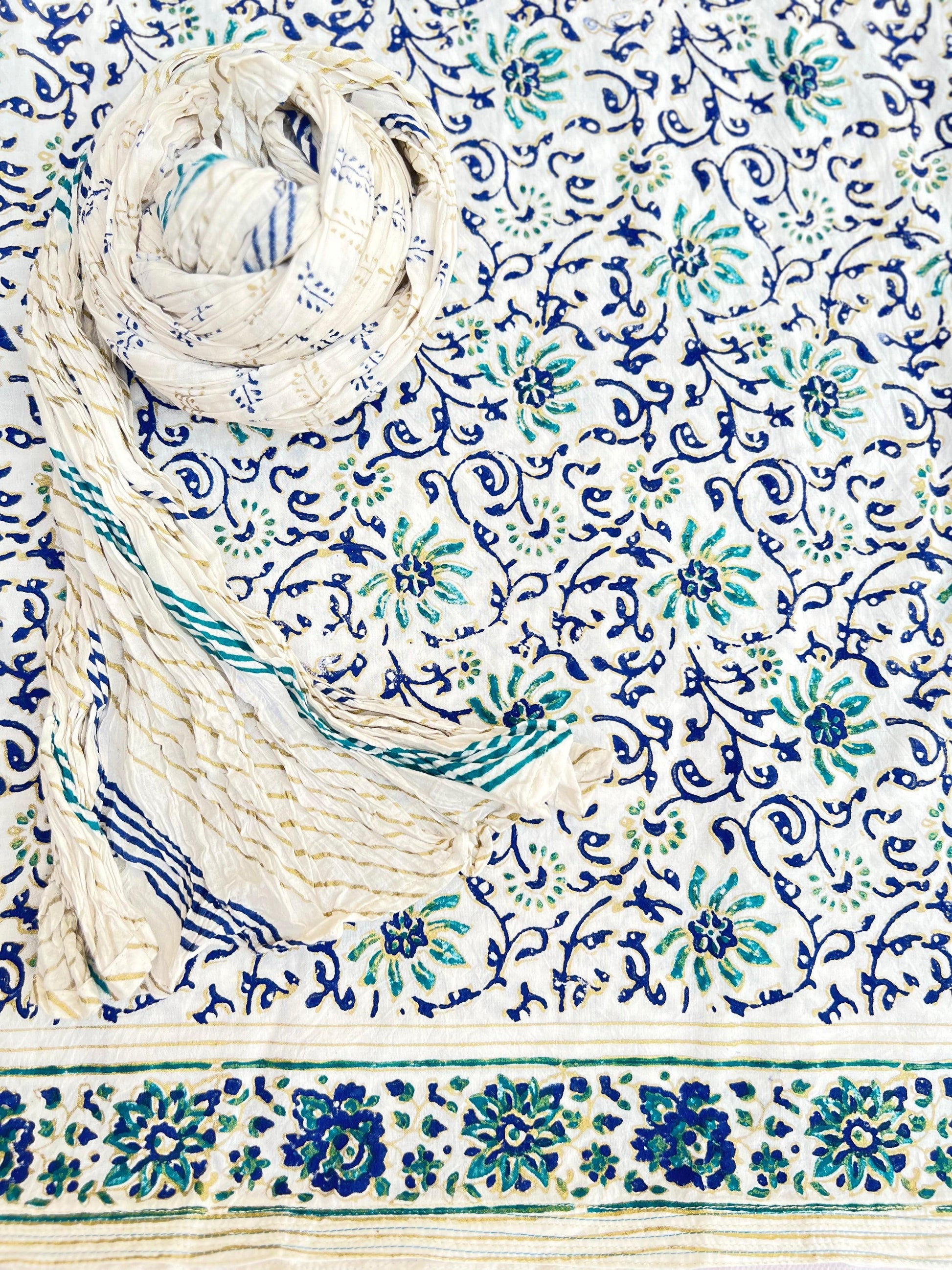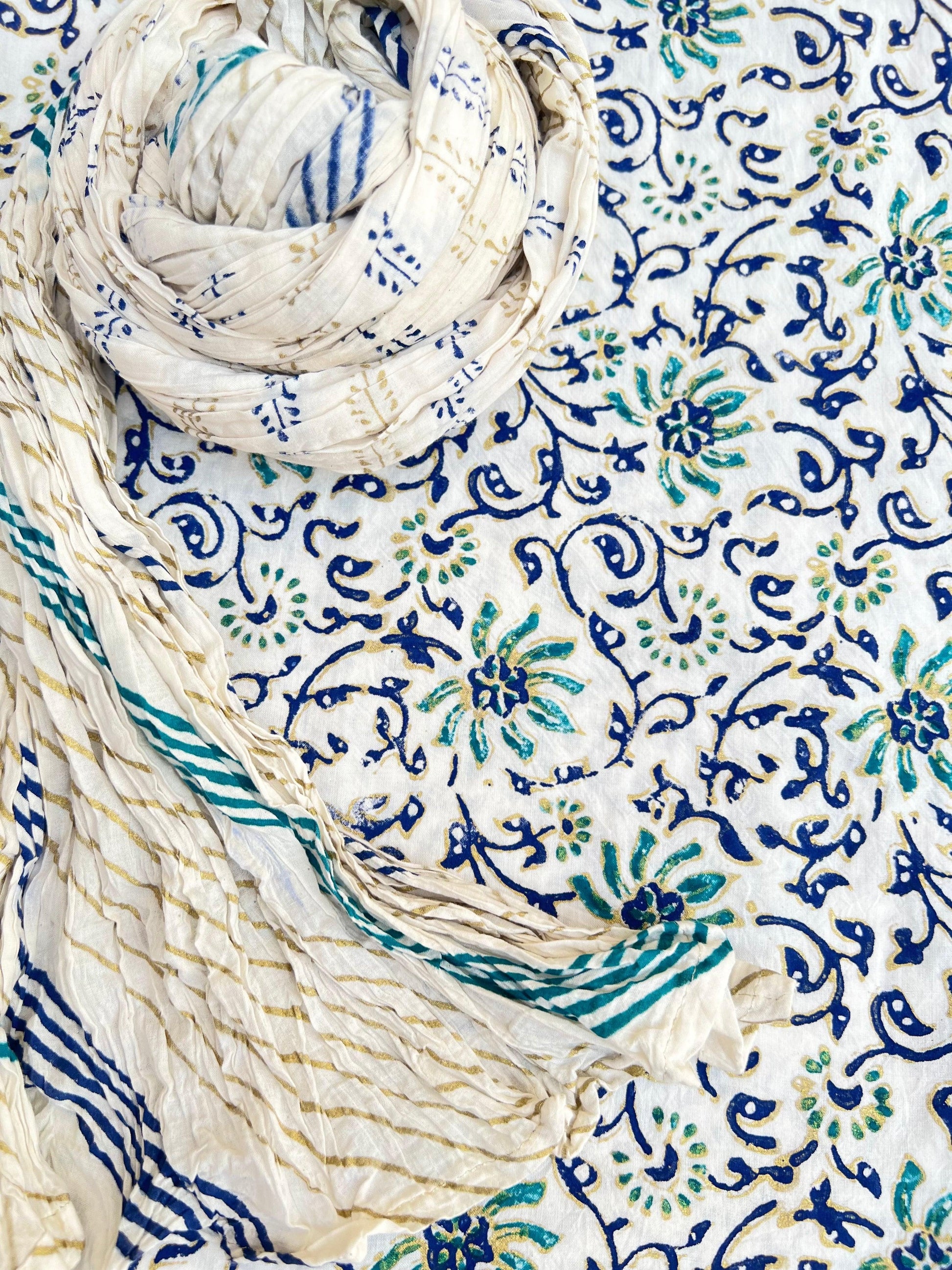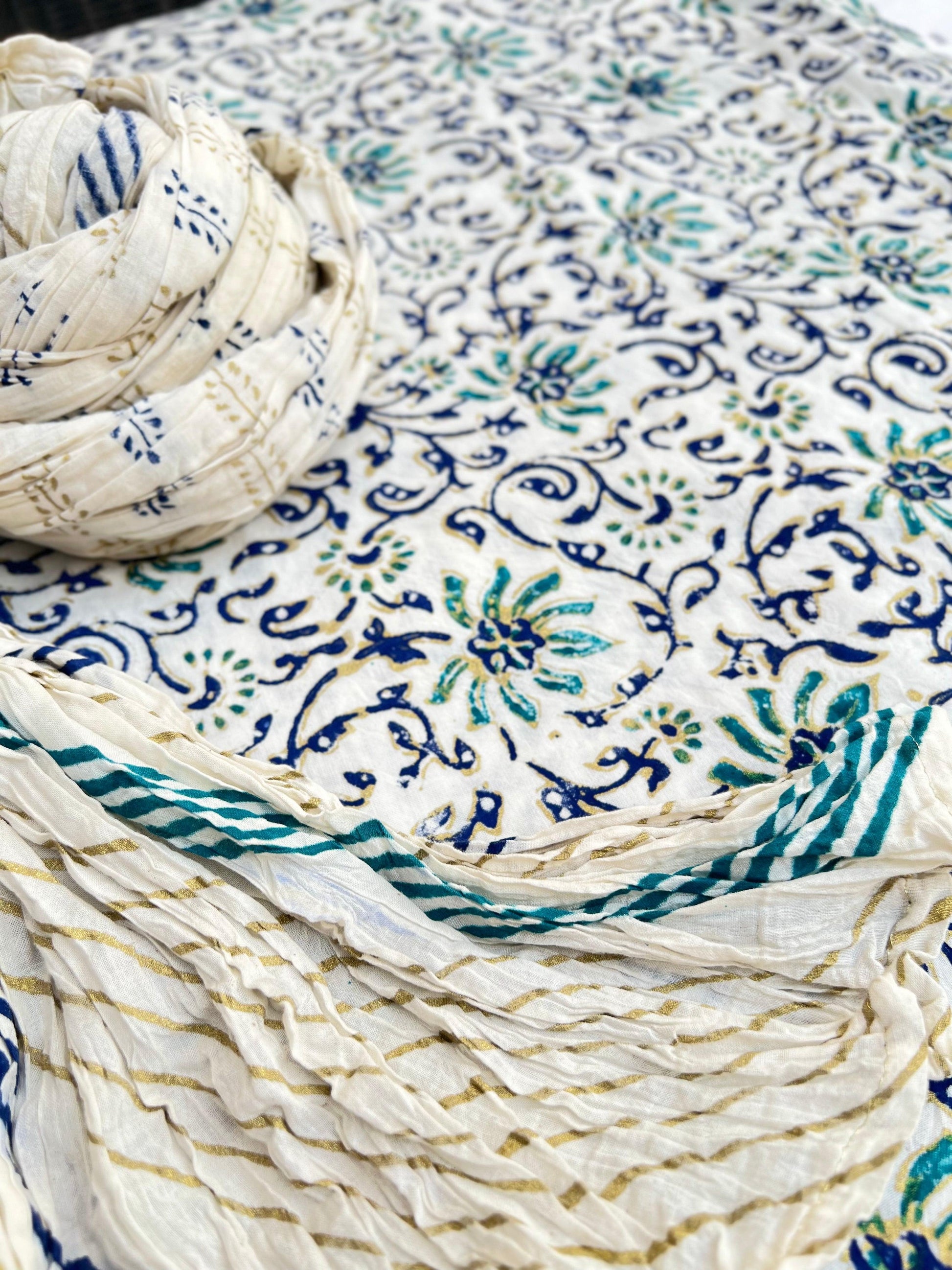 Uplift your look in this Gul-e-Dawoodi floral block printed with gold ferozi and blue - Unstitched Collection