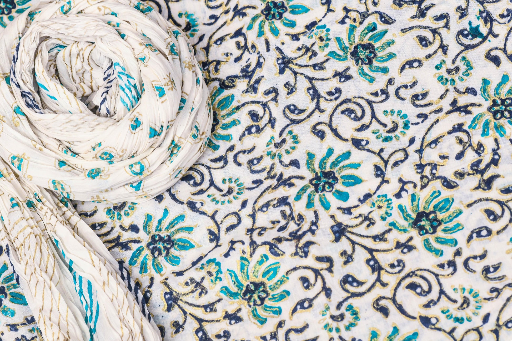 Elevate your style with our new Unstitched Collection, featuring a luxurious gold ferozi and blue hand block printed pure lawn fabric. Effortlessly transition from summer to fall with our versatile floral design. Experience the indulgent feel of pure lawn and make a statement with our sophisticated color combination.